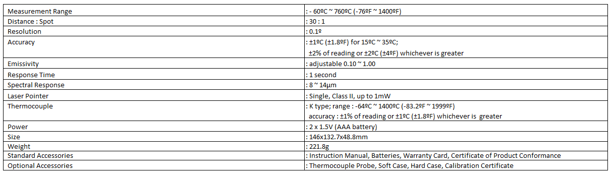 Selain itu, infrared thermometer laser termometer ini disupport thermocouple type K. selain itu infrared thermometer laser termometer ini memiliki dua laser sehingga mempermudah pengukuran.